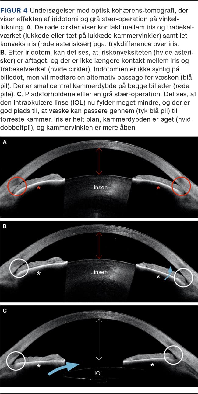 Et alternativ til iridotomi er en grå stær-operation, hvor man kirurgisk fjerner patientens linse og erstatter den med en kunstig linse. Da kroppens egen linse er over 4 mm tyk, og den kunstige linse er under 1 mm, bliver der skabt væsentlig mere plads mellem linsen og iris, således at pupilblokket ophæves. Patienter med vinkellukning eller lukketvinklet glaukomhar ikke nødvendigvis grå stær, og operationen kan udføres alene med det formål at skabe mere plads i øjet, da linsen vokser gennem hele livet. Operationsteknisk er proceduren ens uanset indikationen og benævnes i denne artikel grå stær-operation. Da en grå stær-operation er et kirurgisk indgreb, er der risiko for mere alvorlige komplikationer end ved en YAG-laser-iridotomi, men behandlingen er mere effektiv (Figur 4) [18, 19]. Sikkerheden ved grå stær-operationer er desuden steget væsentligt i de seneste årtier. I 2016 blev der publiceret et studie (EAGLE-studiet) i The Lancet, hvor man randomiserede patienter til enten iridotomi eller grå stær-operation. Dette studie viste, at færre patienter havde brug for tryksænkende medicin efter en grå stær-operation (19% versus 61%), og at færre af dem senere var nødt til at gennemgå en operation for glaukom (trabekulektomi) pga. forhøjet intraokulært tryk [20].