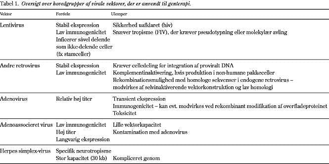 Genterapi har i flere år været nævnt som en meget lovende teknologi, der kunne revolutionere den medicinske behandling af en lang række medfødte og erhvervede sygdomme. Siden de første delvist positive resultater med svær kombineret immundefekt (SCID)-børn i begyndelsen af 1990'erne (1) er der gennemført flere hundrede mindre, kliniske forsøg. Resultaterne har dog indtil for nylig ikke været slående. Vanskelighederne har især vist sig at stamme fra de anvendte vektorer til overførsel af terapeutiske gener (2). Disse vektorer har i langt overvejende grad været modificerede virus, især retrovirus, som i de første udgaver blot var replikationsinkompetente murine retrovirus. Det viste sig imidlertid hurtigt, at virale vektorer var mere komplicerede end først antaget, og problemerne med de virale vektorer har været den afgørende blokering for klinisk anvendelse af genterapi. Disse problemer er nu ved at blive løst, og de seneste ti års molekylærvirologiske forskning har frembragt en række nye vektorer (3), som dels løser nogle af de specifikke problemer ved de gamle vektorer, dels er helt nye vektorsystemer, der er baserede på andre principper eller andre virus end for ti år siden (Tabel 1 ).