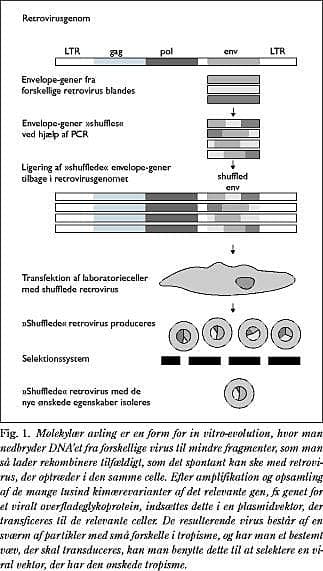 Bred tropisme er nyttig, når det relevante væv er isoleret ex vivo. Bred tropisme kan derimod være et problem, hvis den genterapeutiske strategi er baseret på in vivo-overførsel af det genetiske materiale, især hvis der er tale om systemisk brug af vektoren. Almindelig i.v. injektion af en amfotrop retroviral vektor med det formål at overføre et terapeutisk gen til fx cancermetastaser vil medføre, at vektorpartiklerne optages af irrelevante celler, længe inden de når frem til cancervævet. Bred tropisme kan også beskrives som manglende selektivitet, og bortset fra at dette giver problemer med at få vektormaterialet frem til det relevante væv, betyder det også, at der er en risiko for, at normalt væv, herunder kønsceller i gonaderne, bliver transduceret (5). Problemet kan i nogle tilfælde delvis løses ved at indføre vektoren ved direkte injektion eller vha. et kateter til det relevante sted i organismen, som det fx er gjort ved intrakardial injektion af en adenoviral vektor til fremme af angiogenesen (6). Store anstrengelser har imidlertid været gjort for at udvikle virale vektorer med snæver specificitet for det væv, der måtte være relevant i de konkrete tilfælde. Ofte drejer det sig om rekombinant modifikation af vektorens overflade, så den binder til en karakteristisk struktur på de relevante celler. Således har man fx indsat et enkeltkædeantistof mod overflade-receptoren cluster of differentiation (CD)34 i en AAV-vektor, så vektoren kunne binde til CD34-positive stamceller (7). Disse rekombinante metoder til at opnå specifik tilhæftning har imidlertid i praksis været skuffende, bl.a. fordi en viral vektors tilhæftning til cellen og indtrængen i den som regel beror på forskellige receptorer, der skal virke sammen. Dette problem synes en ny lovende metode, molekylær avling, imidlertid at kunne løse (8) (Fig. 1 ).