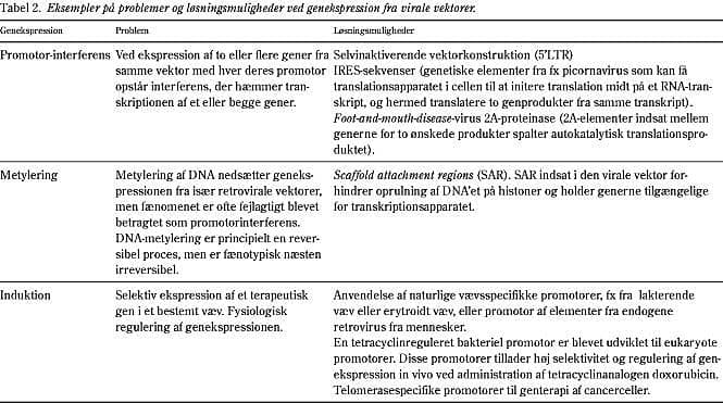 Uanset hvilken vektor der benyttes til overførsel, er målet naturligvis ekspression af et eller flere terapeutiske gener, evt. med en fysiologisk relevant regulering. Virus indeholder fra naturens hånd promotorer, som styrer ekspres- sionen og koordineringen af virusreplikationen. Fjernelse af de virale elementer i vektorerne - bl.a. for at gøre dem replikationsinkompetente - og indsættelse af nye regulerende promotor-elementer byder på yderligere udfordringer for at opnå det ønskede niveau af genekspression. De problemer, som findes, er bl.a. promotor-interferens, polycistroniske effekter, codonbrug, DNA-metylering, histonacetylering mv. Selv om vanskelighederne er betydelige, synes de fleste af disse problemer ikke at være principielt uløselige (Tabel 2 ).