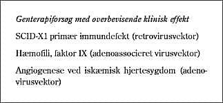 Arvelige sygdomme med en specifik (mono)genetisk defekt som årsag blev oprindelig betragtet som de mest oplagte sygdomme, hvor genterapi kunne give en terapeutisk effekt. Det første positive resultat med genterapi fremkom da også efter behandling af to børn med adenosindeaminasemangel (14). I det seneste og klart succesfulde forsøg behandlede man to børn med X-bunden immundefekt (10). Her blev hæmatopoietiske stamceller transduceret med en andengenerations retroviral vektor under optimerede dyrkningsbetingelser, og patienterne fik ikke anden behandling. I dette tilfælde så man, at patienterne gradvist blev repopuleret med normalt fungerende transgene celler, og der blev opnået klinisk normalisering.