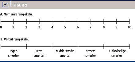 På Region Hovedstadens hospitaler anvendes VAS som førstevalg til måling af smerter, hvis patienten kan samarbejde hertil. Patienter, som ikke kan anvende en VAS, kan anvende en NRS, der kan være udformet som en 11-, 21- eller 101-pointskala (se Figur 1A, hvor en 11-point-NRS-skala vises). NRS kan anvendes grafisk eller verbalt [2]. Et tredje valg kan være verbal rang-skala (VRS), hvor patienten med ord skal beskrive sine smerter. Beskrivelserne kan se således ud: ingen smerter, lette smerter, middelstærke smerter, stærke smerter og uudholdelige smerter (Figur 1B).