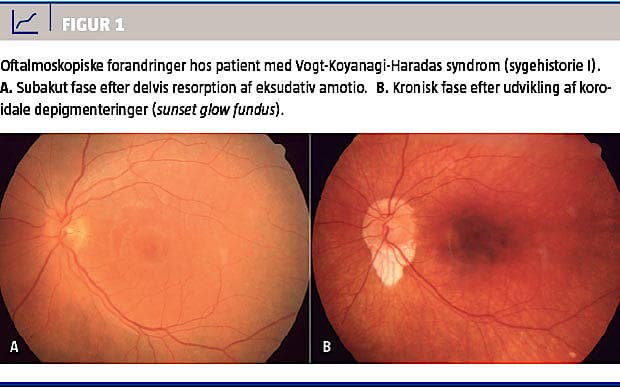 I. En 23-årig, tidligere rask kvinde af asiatisk oprindelse blev henvist til øjenafdelingen på grund af hovedpine, bilateral anterior uveitis og aftagende visus gennem en måned. Ved øjenundersøgelsen fandtes bilateralt nedsat visus til 0,32 og panuveitis med let anterior uveitis, diffus ekssudativ amotio retinae og let papilødem. Alle parakliniske prøver til ætiologisk afklaring var normale. Vævstypen var HLA-DRB1. Den intraokulære inflammation faldt til ro efter behandling med højdosisprednisolon, som blev aftrappet gradvist over måneder. I samme periode fik patienten tiltagende hårtab. I de efterfølgende to år havde hun bilateralt recidiverende anterior uveitis kompliceret med stigende øjentryk, udvikling af glaukom, tiltagende katarakt og retinal depigmentering (Figur 1). Der blev foretaget bilateral tryknedsættende operation og kataraktoperation. Efter syv år var øjensygdommen i ro uden behandling. Visus var 0,8 på højre øje og 1,0 på venstre øje.
