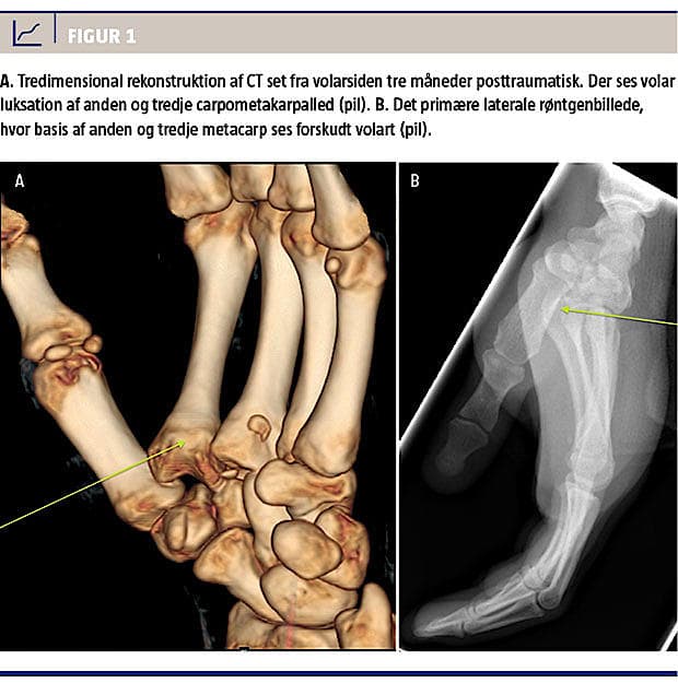 Ved kontrol tre måneder postoperativt bemærkede patienten, at håndryggen var sunket synligt, og der føltes mekanisk stop for tommelens opposition. En CT afslørede nu total volar luksation af anden metacarp og subluksation af tredje metacarp i forhold til den distale karpalrække (Figur 1A). Retrospektivt kunne dette ses på det primære røntgenbillede (Figur 1B). Ved efterfølgende operation sås store bruskskader på ledfladerne. Det lykkedes ved kraftfuld manipulation at reponere begge CMC-led, og de blev transfikseret med tre K-tråde i ni uger.
