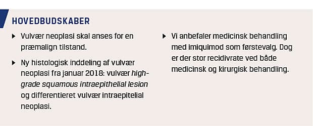 Vulvaneoplasi er en sjælden tilstand med stigende incidens. Tilstanden er præmalign. I januar 2018 blev der indført en ny histologisk inddeling af vulvaneoplasi i HSIL i vulva og dVIN. Vulvær HSIL er HPV-relateret og ses især hos unge kvinder. dVIN rammer ældre kvinder, ses ved kroniske dermatoser, særligt ikkevelbehandlet lichen sclerous, og har et højere malignitetspotentiale. Ved symptomer skal der tages biopsi.