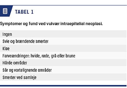 udfordring, især hos kvinder i 40’erne. Til trods for at spontan regression ofte ses, skal VIN anses for en præmalign tilstand [1]. VIN viser sig oftest i form af svie, brænden og kløe, men kan også være asymptomatisk. Risikofaktorer som tidligere tilfælde af vulvaneoplasi, kønsvorter og immunsuppression skal klarlægges. Rygning er stærkt associeret til vulvær high-grade squamous intraepithelial lesion (HSIL), hvorfor rygestop skal anbefales [2, 3]. Lichen sclerosus er også associeret med vulvaneoplasi, men velbehandlet nedsættes risikoen for neoplasiudvikling formentlig [4]. Der findes en stærk sammenhæng mellem VIN og cervixneoplasi, hvorfor der ved fund af VIN bør tages cervixsmear [5]. Anamnesen er således vigtig.