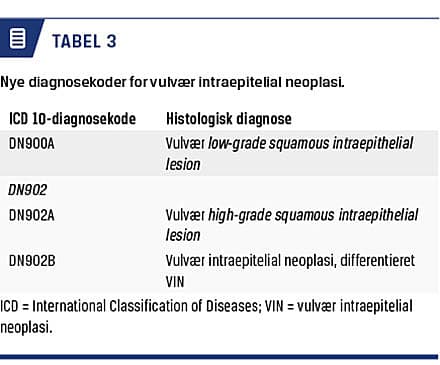(5-10% af alle VIN), men giver større risiko for progression til vulvakarcinom [8]. At genkende dVIN er en udfordring for selv erfarne gynæko-dermato-patologer. Immunhistokemi kan hjælpe med diagnosen. Der er fra januar 2018 indført nye diagnosekoder med inddeling efter en ny nomenklatur. Vi anbefaler, at man fremover anvender de nye klinisk relevante koder (Tabel 3).