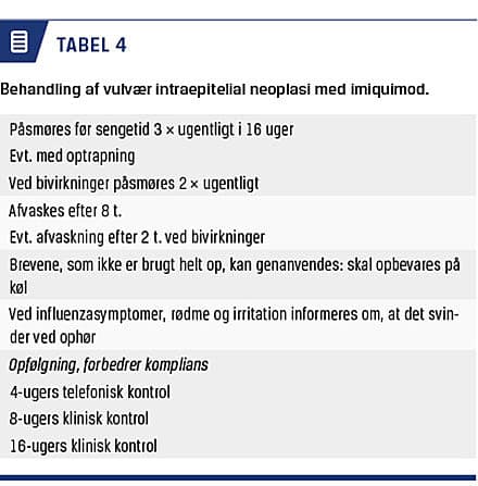 anbefaler som førstevalg medicinsk behandling med imiquimod for at undgå mutilerende indgreb. Immunsupprimerede patienter med VIN skal have særlig opmærksomhed. HPV-vaccine kan tilbydes patienter med vulvær HSIL. Vi anbefaler individualiseret opfølgning og gerne oplæring i egenomsorg og -kontrol, når sygdommen er velbehandlet.