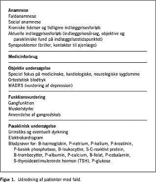 For at karakterisere patienterne og beskrive forekomsten af risikofaktorer blev alle undersøgt som det foreslås i »Guidelines for the prevention of falls in older persons« [8] (Figur 1 ). Selv om nogle fald kan forklares ved snublen eller som udløst af akut medicinsk sygdom kan konkurrerende risikofaktorer gøre sig gældende. Følgende risikofaktorer indgik: