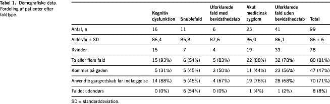 Hundrede patienter blev udvalgt, en patient udgik, da der ifølge den uddybende anamnese alligevel ikke havde været fald i relation til indlæggelsen. Alderen var gennemsnitlig 86 år, og der var en kønsmæssig overvægt af kvinder. Mange havde før indlæggelsen funktionsnedsættelse: 70 anvendte et gangredskab, og 52 gik ikke selvstændigt på gaden (Tabel 1 ).