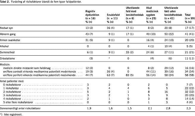 I Tabel 2 vises fordelingen af risikofaktorer. Ved χ2 -test var risikofaktorerne indbyrdes uafhængige og ikke relaterede. Gennemsnitligt fandt vi 2,3 risikofaktor pr. patient (median 2). De fem typer var signifikant forskellige med hensyn til antallet af risikofaktorer (Kruskall-Wallis-test: p = 0,02). Antallet af risikofaktorer i gruppen af patienter med uforklarede fald uden bevidsthedstab var signifikant større end i de øvrige patientgrupper (Mann-Whitney-test: p = 0,002).