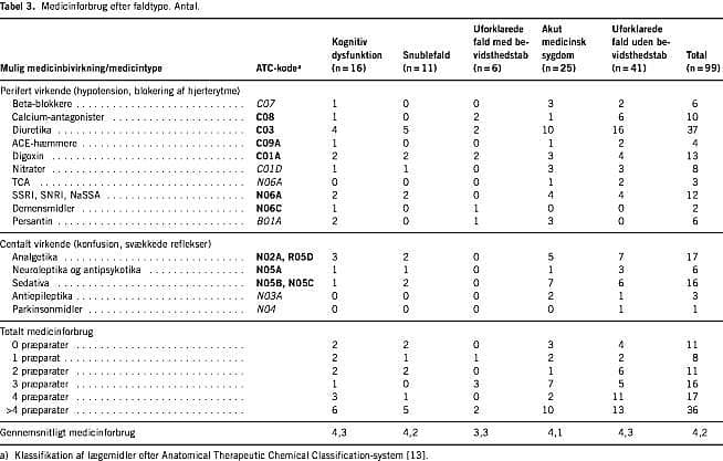 I Tabel 3 vises medicinforbruget på faldtidspunktet. Over halvdelen af patienterne fik medicin, som vides at kunne påvirke blodtryk, blodcirkulation og hjerterytme (58%), 34% fik stærkere analgetika, neuroleptika, sedativa, antiepileptisk medicin eller midler mod parkinsonisme. Det gennemsnitlige medicinforbrug var på 4,2 præparater uden signifikant forskel på patienternes faldtyper.