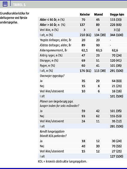 Blandt dem, som efter første undersøgelse rent faktisk havde været hos egen læge, og som kom igen til anden undersøgelse, og blandt dem, der ved anden undersøgelse havde planer om at opsøge egen læge, udgør de raske kun 25%, hvorimod halvdelen af dem med KOL - uafhængigt af sværhedsgrad - og af dem med potentiel lungesygdom har været eller planlægger besøg hos egen læge på grund af deres lunger.