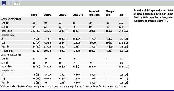 I Tabel 2 er alle personer fra henholdsvis første og anden undersøgelse (344 personer) vist iht. resultatet af deres lungefunktionsmåling med angivelse af antal pr. gruppe og i procent for begge køn. Ved første undersøgelse viste lungefunktionsmålingerne, at 43% var raske, 5% kunne ikke gennemføre anvendelig spirometri, og 9% blev placeret i gruppen potentielt lungesyge. 21% havde mild KOL svarende til GOLD 1, 17% havde moderat KOL svarende til GOLD 2, og 5% havde svær eller meget svær KOL svarende til GOLD 3+4.