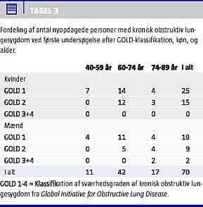 Tabel 3 viser fordelingen af personer med nyopdaget KOL ved første undersøgelse iht. GOLD, køn og alder. Der var i alt 70 personer med en obstruktiv spirometri ved første undersøgelse, som havde svaret nej på spørgsmålet om kendt lungesygdom forud for undersøgelsen (jf. Tabel 1 nederst). Som det fremgår, var der 11 personer under 60 år, og disse personer havde kun mild KOL svarende til GOLD 1. I alt 42 personer var mellem 60 og 74 år, og disse personer havde enten mild eller moderat KOL svarende til GOLD 1 og 2. I alt 17 personer var fra 75 år og opefter, og disse personer var fordelt på alle sværhedsgrader med hensyn til KOL svarende til GOLD 1-4.
