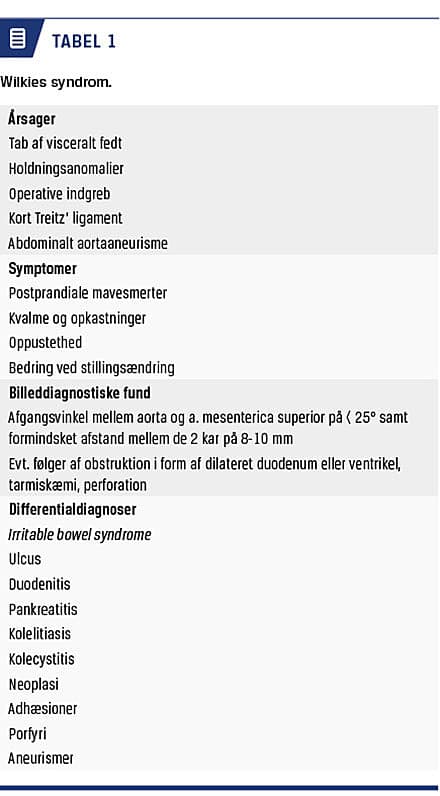 Wilkies syndrom er en sjælden tilstand med en prævalens på 0,01-0,3% og en overvægt hos unge kvinder [1]. Ved syndromet sker der en afklemning af duodenum som følge af en reduceret vinkel mellem aorta abdominalis og arteria mesenterica superior.