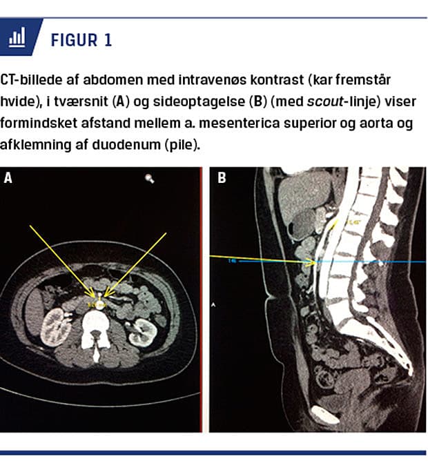 På grund af det langvarige forløb henvistes patienten til CT af abdomen. Denne viste normale forhold, fraset en reduceret vinkel mellem a. mesenterica superior og aorta (16 grader) og nedsat karafstand på niveau med duodenum (6 mm) (Figur 1). Der var ikke på skanningstidspunktet udspiling af duodenum eller ventrikelretention.