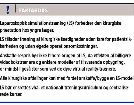 Laparoskopisk simulationstræning er en veldokumenteret effektiv, patientsikker og resursebesparende træningsform. Simulationstræning er dog ikke udbredt i Danmark, sandsynligvis på grund af den høje anskaffelsespris på VR-simulatorer og andre kommercielle træningsmodeller. Effekten af billigere VB-trænere og enklere modeller af tilsvarende opbygning er imidlertid lige så stor, og på nogle områder tilmed større, hvorfor prisen ikke burde være nogen hindring for implementering. Der bør udarbejdes et nationalt træningscurriculum med fokus på systematisk og intensiv træning af tiltagende komplekse opgaver, op til et forudbestemt læringsniveau. Træningskurser kan centraliseres, men genopfriskende træning er vigtigt, og alle kirurgiske afdelinger kan med fordel anskaffe en eller flere billige simulatorer.
