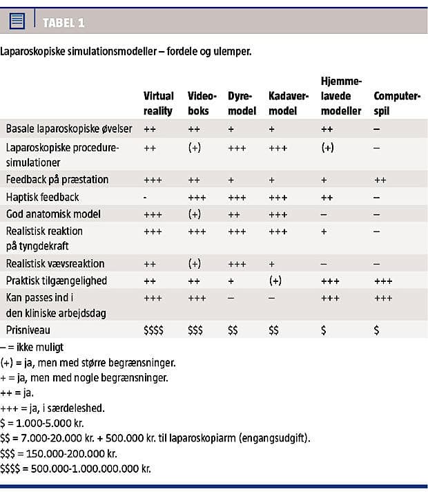 Tabel 1. Ved sammenligning af forskellige træningsmodaliteter viste ovennævnte metaanalyse imidlertid, at VB medførte kortere proceduretider og havde en højere brugertilfredshed end VR [19]. VB medførte desuden større forbedring af de laparoskopiske evner end træning på både dyr og kadavermodeller [19]. Det er imidlertid interessant, at træning på billigere simulationsmodeller, som efterligner VB i opbygning, havde en tilsvarende, og i enkelte studier tilmed bedre, effekt end VB [14, 19].